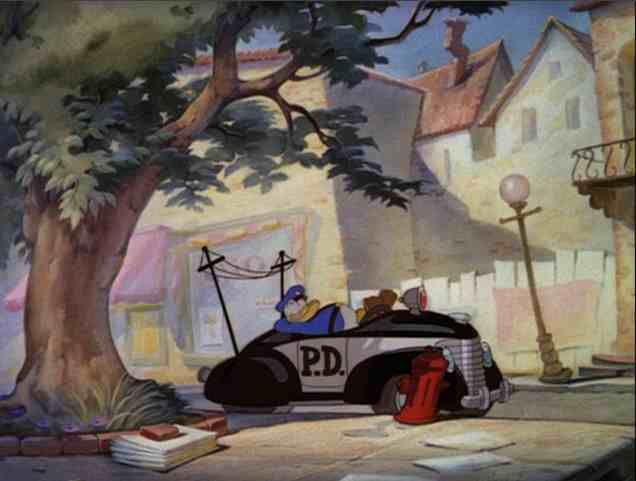 Comments: This is the final Disney theatrical short for the year. It's possible the Standard Oil short could have come out after this tho, but it's not quite the same thing. I assume Disney had to redirect most of their energies to finishing off Pinocchio, released about four months after the release of this cartoon. The dispatcher has a certain drawl reminiscent of Lionel Barrymore, tho it's clearly not a vocal caricature. The dashboard clock in Donald's car is great. Don drives recklessly. For some reason, Donald isn't afraid of Tiny Tom (played by Pegleg Pete) when he doesn't believe he's the object of his arresting needs, but is afraid once he realizes Tom is Tom. Pete's a pretty good caregiver. Lone Ranger reference (Pete says "hi ho Silver"). Donald wins at the end for no good reason.